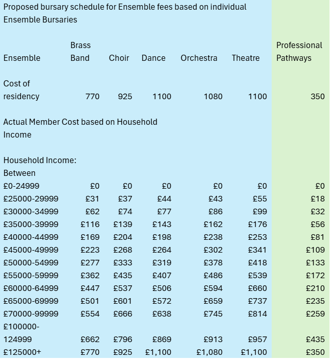 We aim to make sure that money is never a barrier to participation in any of our ensembles or projects. We simply ask applicants to make a contribution to the cost of their audition and participation where they can afford. However, we understand that for some applicants any contribution may be out of reach, which is why we run a generous bursary scheme that supports where support is needed. We consider each applicant’s household’s income, with the aim to offer help with some or all of the contribution. We also offer an instalment payment plan.